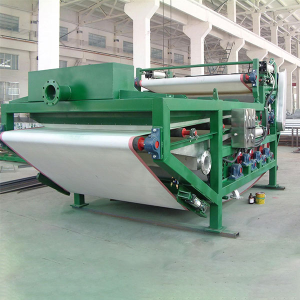 Принцип работы ленточного фильтр-пресса следующий: флокулированные взвешенные твердые частицы и шлам, смешанные с флокулянтом, поступают в механизм обезвоживания. Под совместным воздействием силы тяжести, сжатия и инверсии шлам теряет большую часть свободной воды в секции концентрирования. Затем предварительно обезвоженный шлам равномерно распределяется по фильтрующей ленте через загрузочный бункер. попадает в двухслойный зазор фильтрующей ленты для предварительного отжима. Затем шлам проходит через ряд прессовальных валков, расположенных в порядке убывания диаметра. Фильтрационный осадок подвергается постепенно увеличивающимся силам сжатия и сдвига, в результате чего из материала удаляется оставшаяся свободная вода и часть капиллярной воды. Обезвоженный материал в конечном итоге выгружается через задний сливной патрубок.