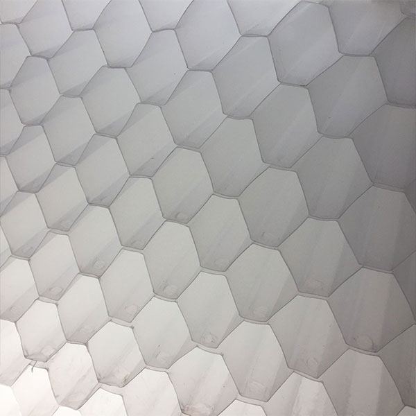 1. Откройте упаковку сотового наполнителя и положите первый кусок на ровную поверхность. Возьмите второй кусок наклонного трубчатого наполнителя и положите его поверх первого куска. Проверьте срезанные края сотового наполнителя, чтобы убедиться, что они сохраняют угол 60 градусов и имеют шестиугольную сотовую структуру. После проверки приступайте к термосварке соединительных точек.